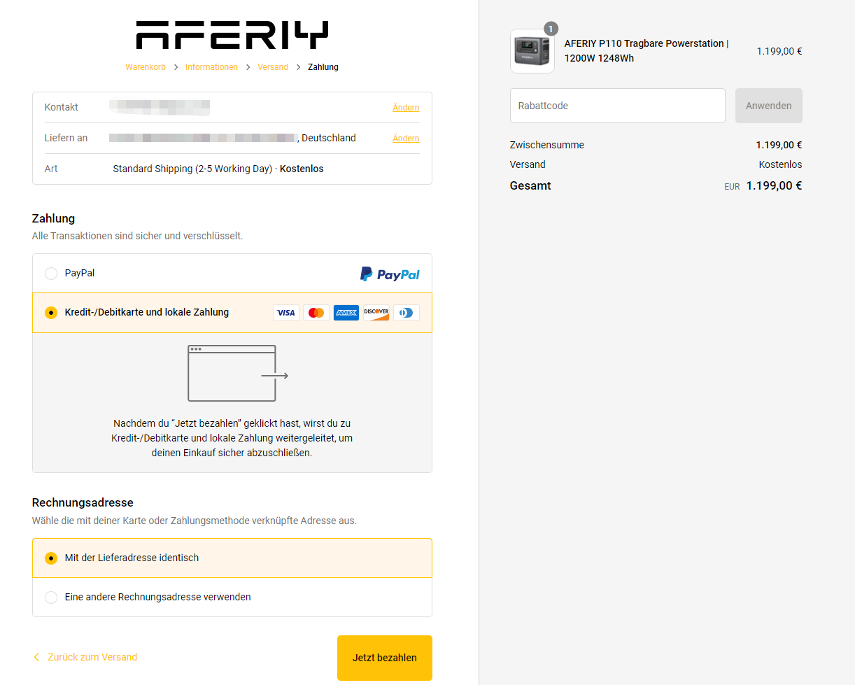 Bestätigen Sie, dass die Kontakt- und Adressinformationen korrekt sind, und klicken Sie auf die Schaltfläche „Weiter zur Zahlung“.