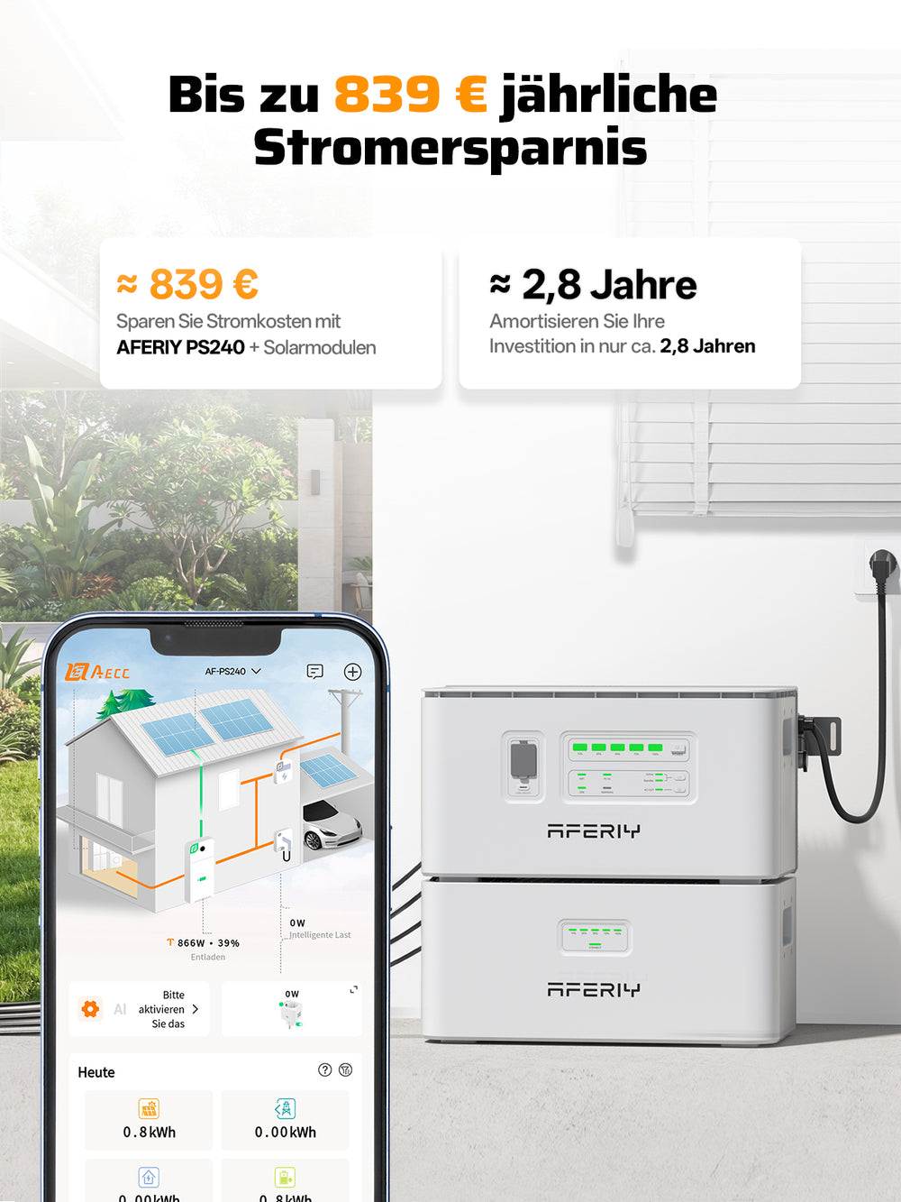 Mit der intelligenten App lädt PS240 automatisch bei niedrigen Strompreisen und entlädt bei hohen Tarifen. In Kombination mit der Echtzeit-Verbrauchsüberwachung lassen sich jährlich Stromkosten von bis zu über 839 € einsparen.