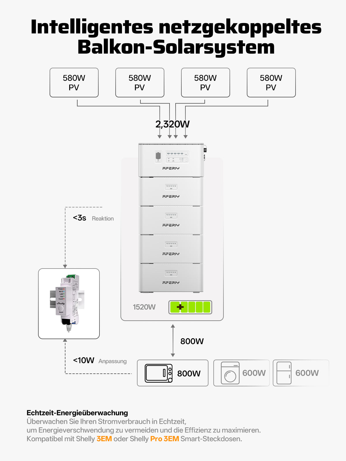 AFERIY PS240 bietet bis zu 2400 W Solar-Eingangsleistung und ermöglicht eine Plug-and-Play-Aufrüstung des Balkonkraftwerks ohne Umbauten. Mit bis zu 9792 Wh erweiterbarem Speicher, 1200 W Insel- und 800 W netzgekoppeltem AC-Ausgang sowie 10 ms Umschaltung bei Stromausfall versorgt es wichtige Verbraucher zuverlässig. Die EVE® LiFePO₄-Batterie mit 6000+ Zyklen, IP65-Schutz und Betriebsbereich −20 °C bis 55 °C macht PS240 ideal für den langfristigen Outdoor-Einsatz.